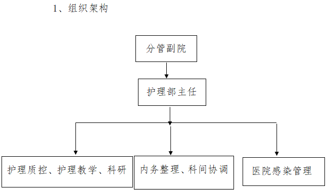 护理部作为医院的一个职能部门,在院长的领导下,实行分管院长——护理部——护士长三级管理,设护士长3名,对医院护理质量、护理安全等进行全面全程控制,并进行总结、分析、评价,持续改进。全面负责医院的护理管理,教学及科研工作,负责制定医院护理工作规划、年度工作计划、工作制度、护理人员岗位责任、护理质控标准等,并组织落实。