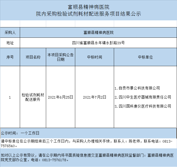 富顺县精神病医院 院内采购检验试剂耗材配送服务项目结果公示