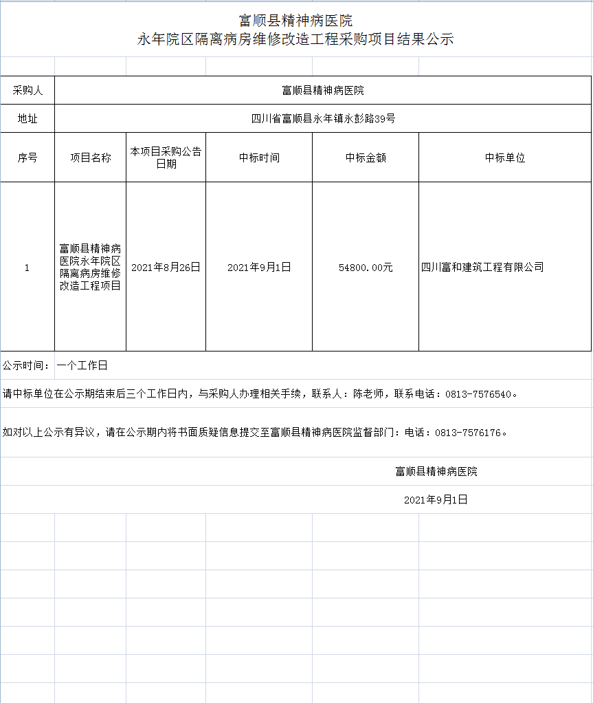 富顺县精神病医院永年院区隔离病房维修改造工程采购项目结果公示