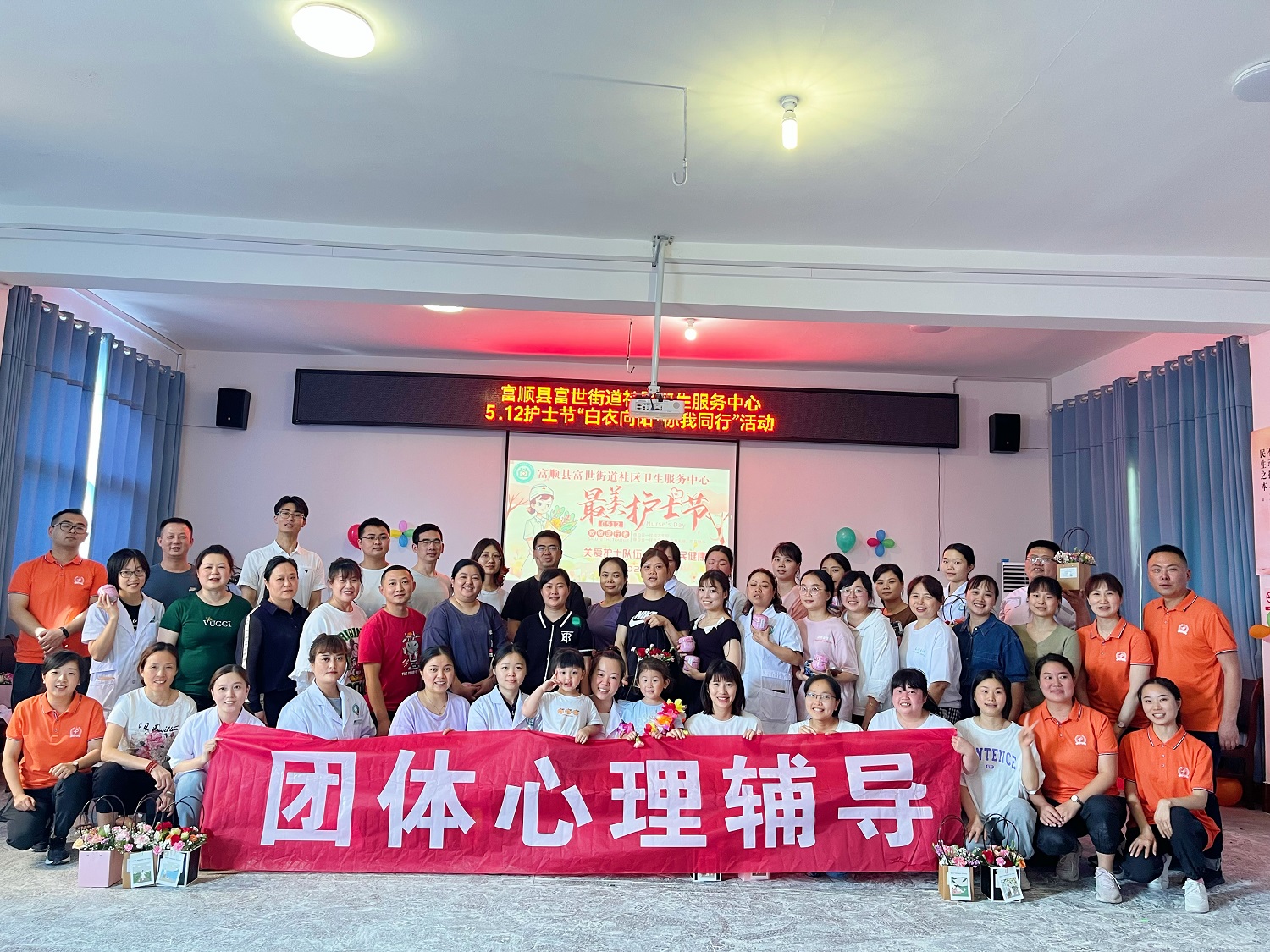 在“5·12”国际护士节来临之际,为更好地关注基层医护人员心理健康,缓解基层医护人员工作和生活压力,提升团队凝聚力,5月12日下午,富顺县社会心理服务办公室联合富世街道社区卫生服务中心,为该服务中心45名医护人员组织开展了一场主题为“白衣向阳 你我同行”团体心理辅导活动。本次活动由富顺县精神病医院精神康复科团队主持开展。