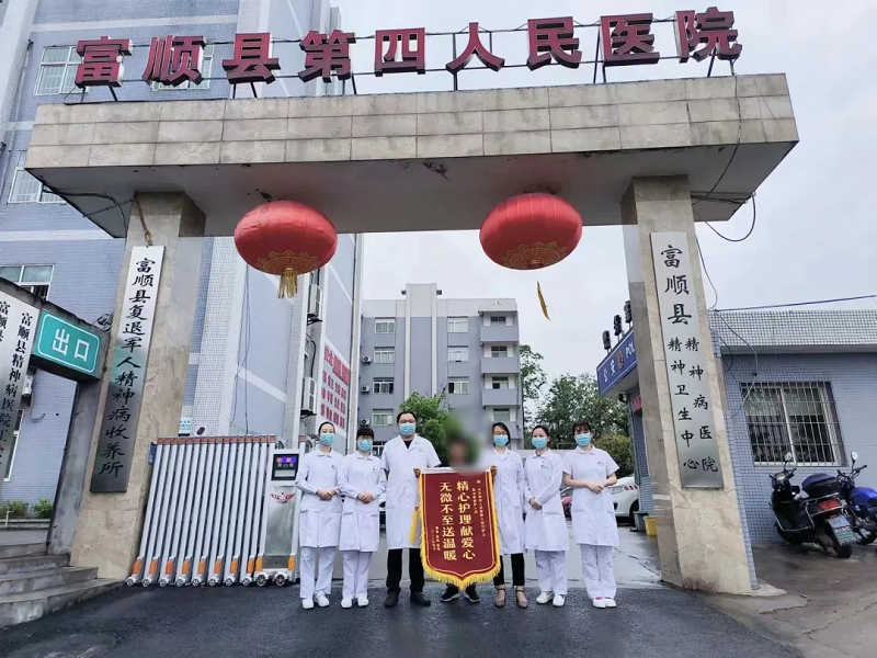 2023年4月18日,一位精神康复员来到富顺县第四人民医院,为精三科医务人员送来一面锦旗,并兴高采烈地对医务人员说,“老师,我现在很好,不需要家属的帮助了,还找了一份工作,拿到了第一份工资,我当时首先就想到了你们,感谢你们在我住院期间的精心治疗与悉心照顾,在这里让我感受到了亲人般的温暖,使我对今后的生活充满了信心。”